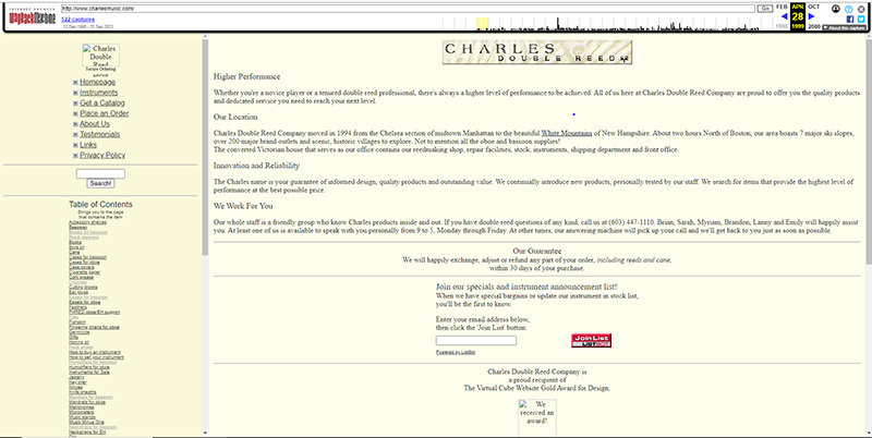 Around this time, I became fascinated by HTML, the coding language for websites, and recognized the potential of the internet to replace printed catalogs. We were fortunate that the first to embrace online purchasing were the military and universities, both large buyers of double reed instruments and reed-making materials. I became proficient in HTML and other coding languages and launched a simple two-page website for Charles Double Reed Company. Within months, I had figured out how to accept orders via email, a rudimentary process through AOL. Soon, “you’ve got mail” also meant “you’ve got orders.” We were fully online selling double reeds and instruments by 1992, a full three years before Amazon first accepted online orders.