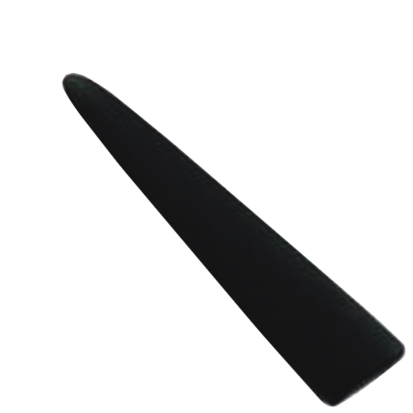 This opaque black plastic plaque has a slightly bellied center with one gently pointed end.