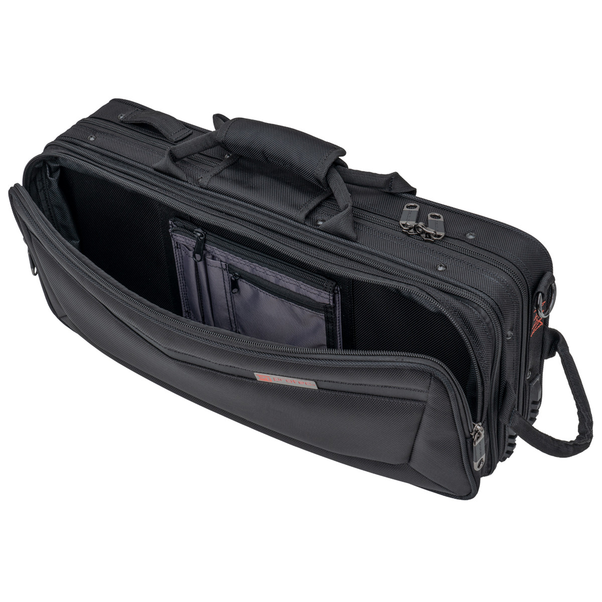 Features include: Durable 1680 denier nylon exterior which is water and abrasion resistant, roomy exterior pocket, high quality rugged zipper, metal hardware, built-in organizer to hold pens, keys, and small accessories. Protects your instrument with a lightweight shock absorbing frame. Features a large gusseted front pocket which is perfect for storing smaller accessories and can also be expanded to accommodate an oboe case. A rugged carrying strap and ID tag are included. The padded handle grip is secured by Velcro. Comes with backpack connection points. Backpack straps are sold separately.