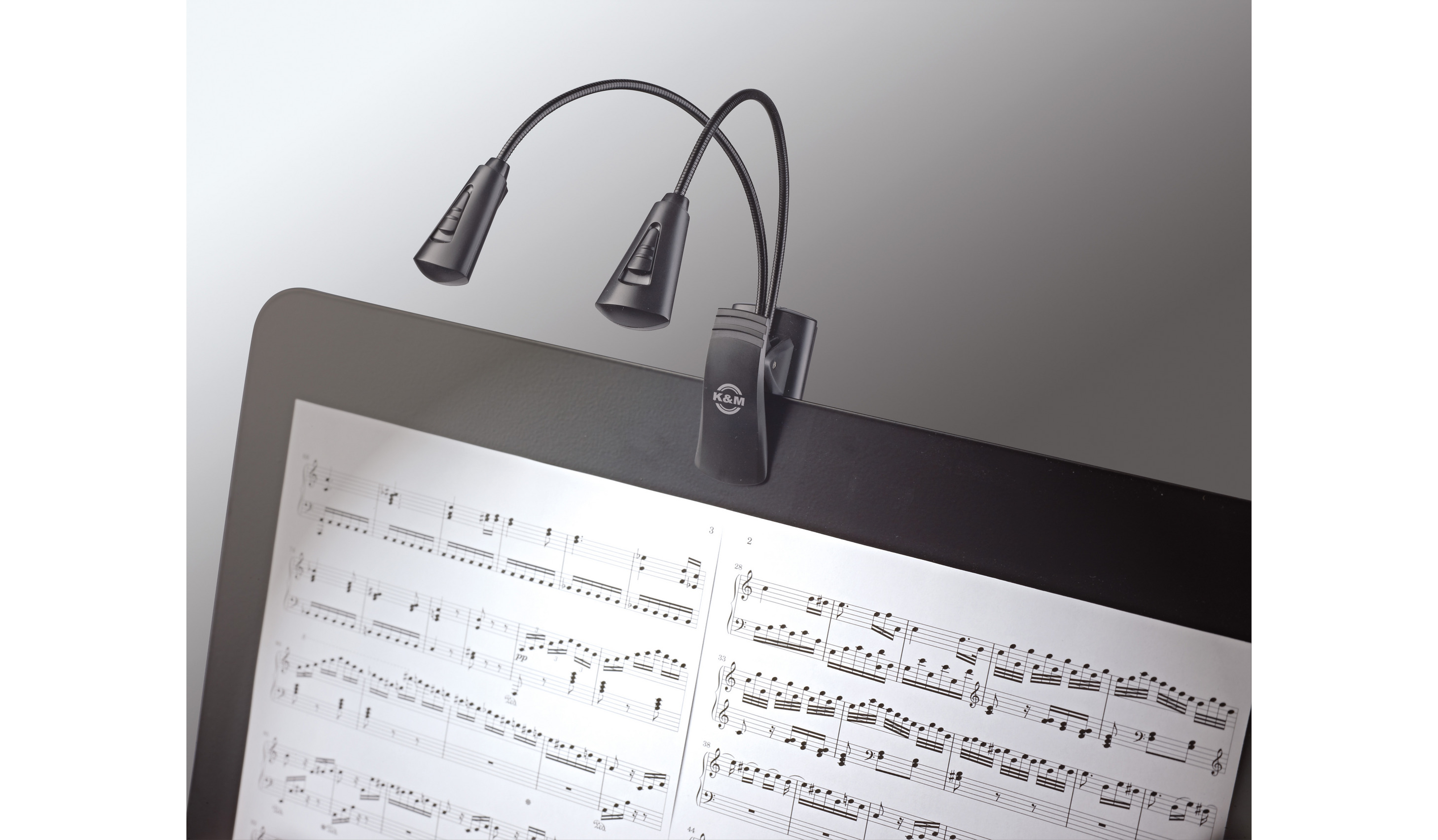 The practical and extra-wide clip (up to 25 mm) attaches to music desks, table tops etc. It can also be used as a standing light.